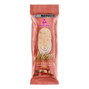 Picolé sabor cheesecake com mescla de morango e cobertura de chocolate belga branco com morango