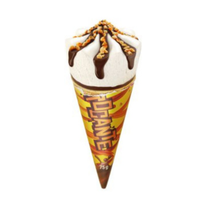 Sorvete sabor baunilha com recheio de caramelo e cobertura de chocolate com crocante de amendoim